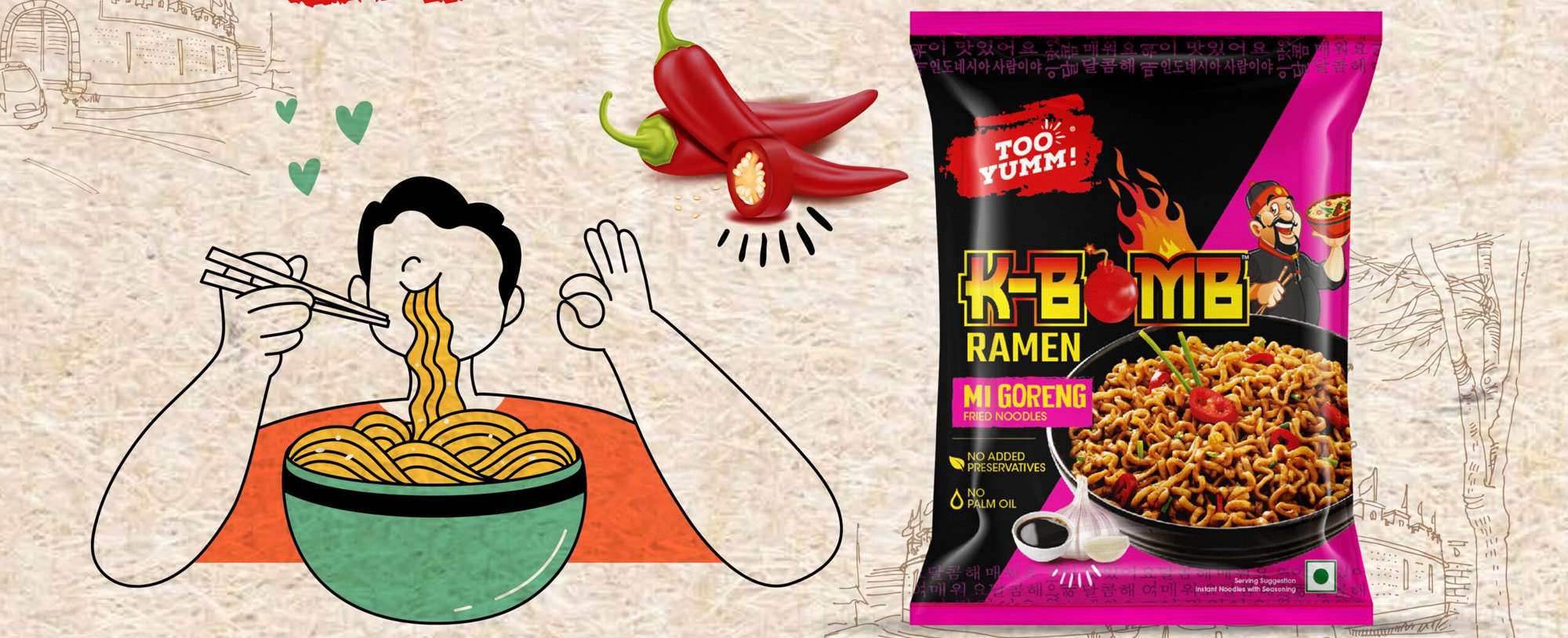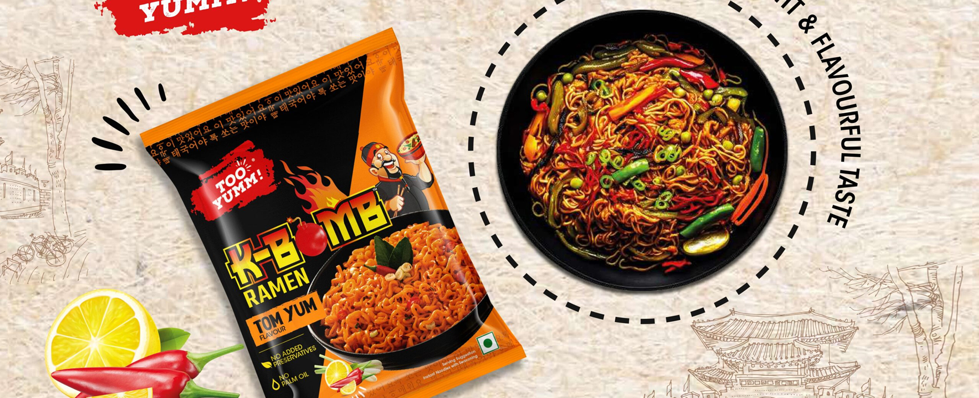 Too Yumm! aimed to enter the competitive instant noodles market with a product that offers disruptive, appetizing, and unique flavors from South Asia. The challenge was to design packaging that: